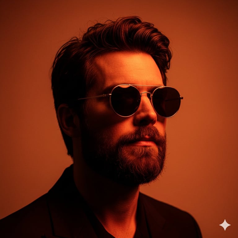 A structured JSON prompt for Nano Banana Pro focusing on generating an ultra-realistic 8K high-fashion portrait. It mandates strict facial feature preservation and specifies dramatic warm red-orange cinematic lighting, deep shadows, and a subject wearing large gold-rimmed sunglasses.