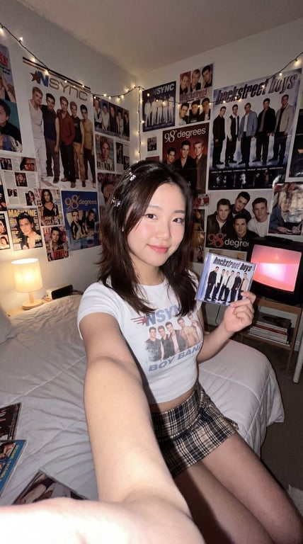 A detailed JSON prompt for Nano Banana Pro 3.0 to generate an ultra-photorealistic, raw selfie image with a 90s aesthetic. The scene is a fangirl bedroom covered in boy band posters. The subject is a young Korean woman with a slim hourglass figure, wearing a tight cropped baby tee and a plaid mini skirt, posed sitting on the bed holding a CD case.