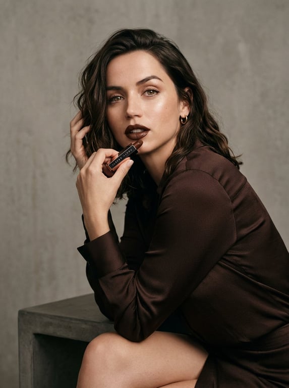 A structured JSON prompt for Nano Banana 2 to generate a glamorous, hyper-realistic beauty advertisement featuring Ana de Armas, emphasizing glowing skin, specific lipstick details, and cinematic lighting in a minimalist setting.