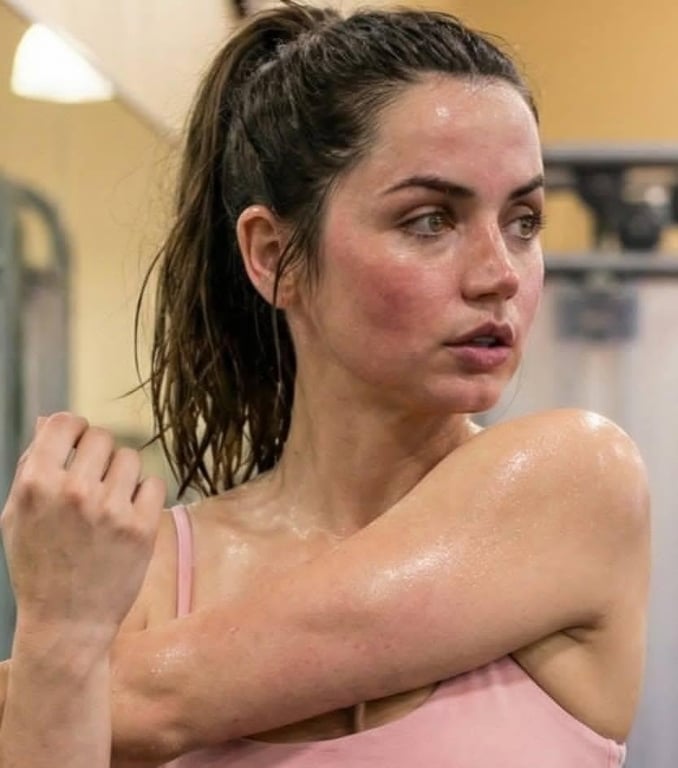 A detailed JSON prompt for generating a series of images of Ana de Armas looking exhausted after an intense workout at a public gym. It specifies physical details like sweaty skin, messy hair, pastel pink activewear, and uses shallow depth of field to focus on the subject's expression and exhaustion.