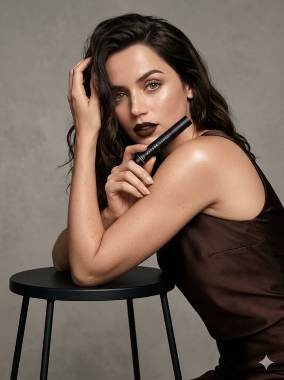A prompt for Nano Banana 2 designed to generate an 8K high-end advertisement featuring Ana de Armas holding Fenty Beauty chocolate-brown lipstick, emphasizing cinematic lighting, glowing skin, and a minimalist background for a luxury magazine aesthetic.