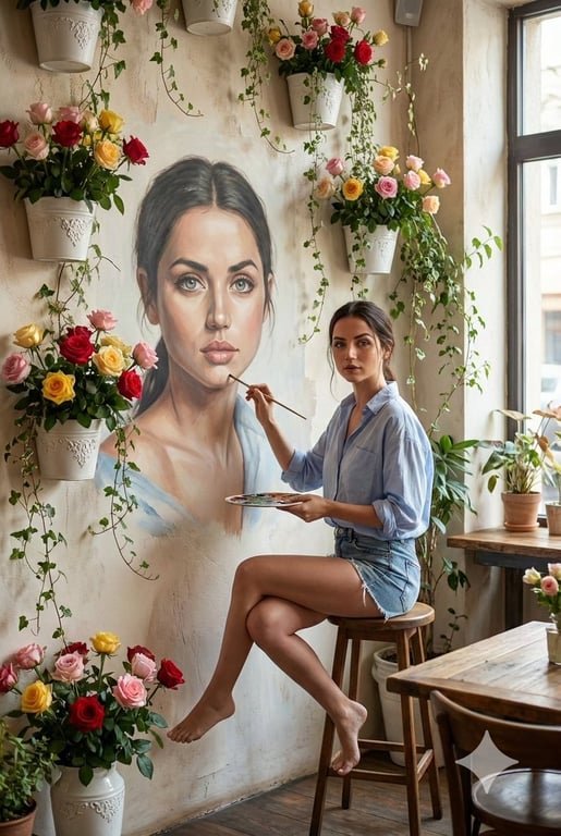 A complex, structured JSON prompt for generating an ultra-realistic cinematic portrait of Ana de Armas as a wall artist. The key feature is the requirement for the subject to be painting a mural of her own face that perfectly matches her real facial features and expression, set in a cozy, naturally lit artistic café.