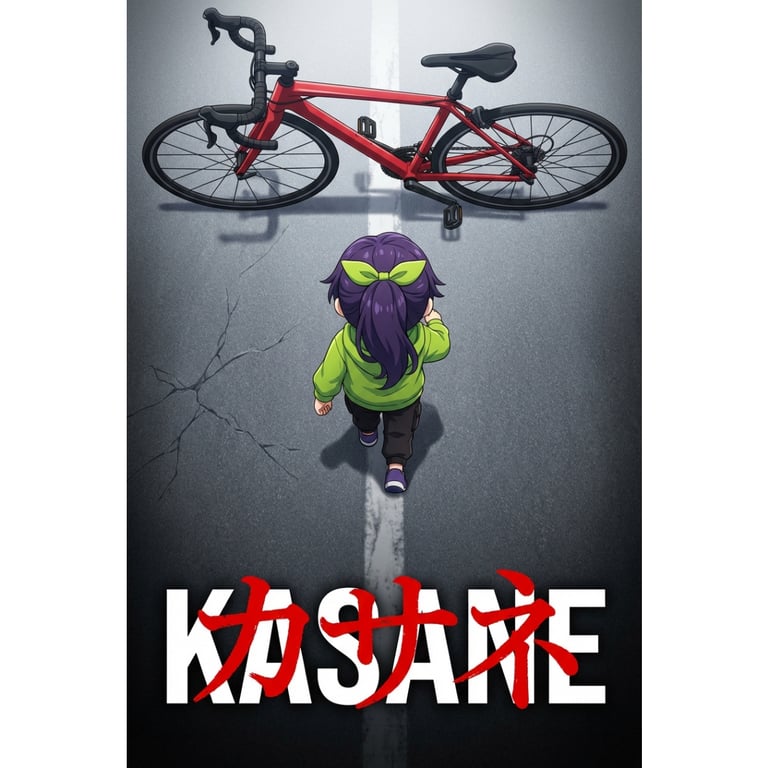 A highly structured prompt for Nano Banana Pro to generate an anime movie poster illustration featuring a chibi character from behind, stepping towards a red road bike. The prompt specifies the art style, composition, camera angle (overhead), lighting, and text overlays.