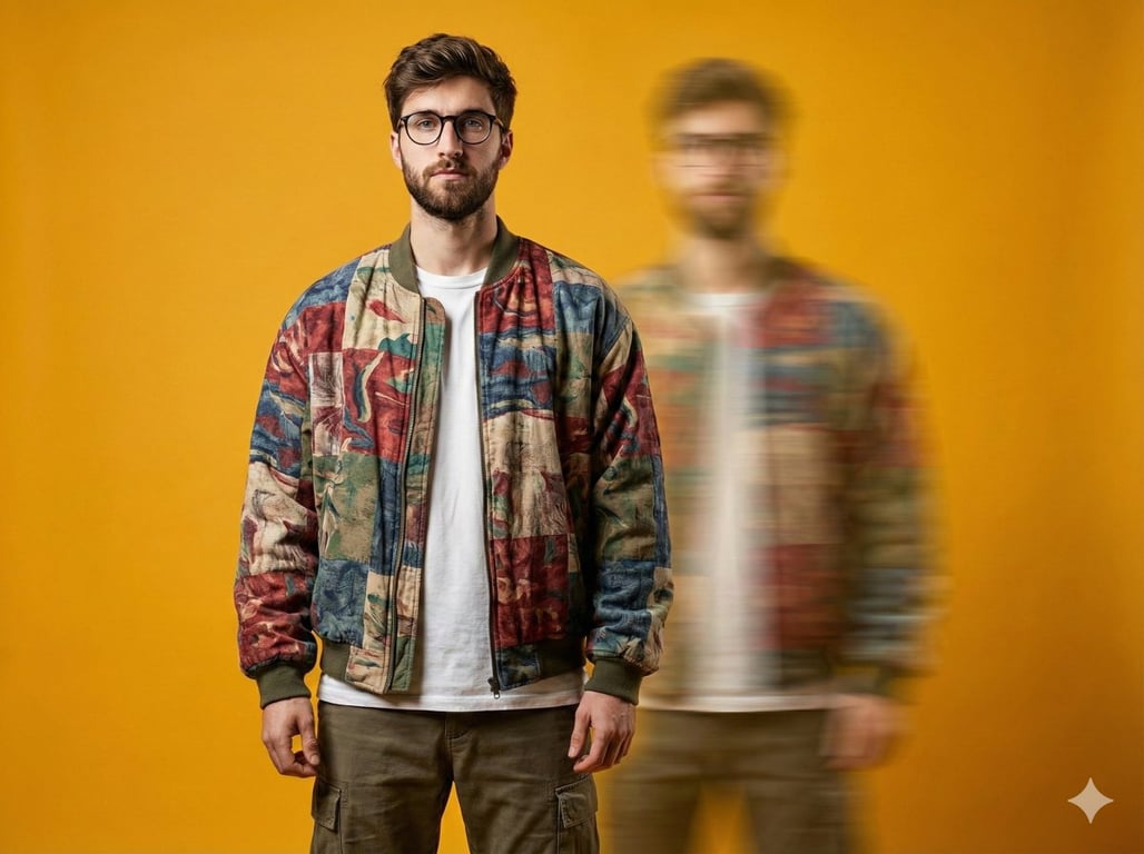 A prompt for an ultra-realistic, 8K cinematic studio portrait featuring a figure in an eclectic bomber jacket against an ochre-yellow background, with the unique artistic element of a translucent, motion-blurred ghost duplicate conveying temporal distortion.
