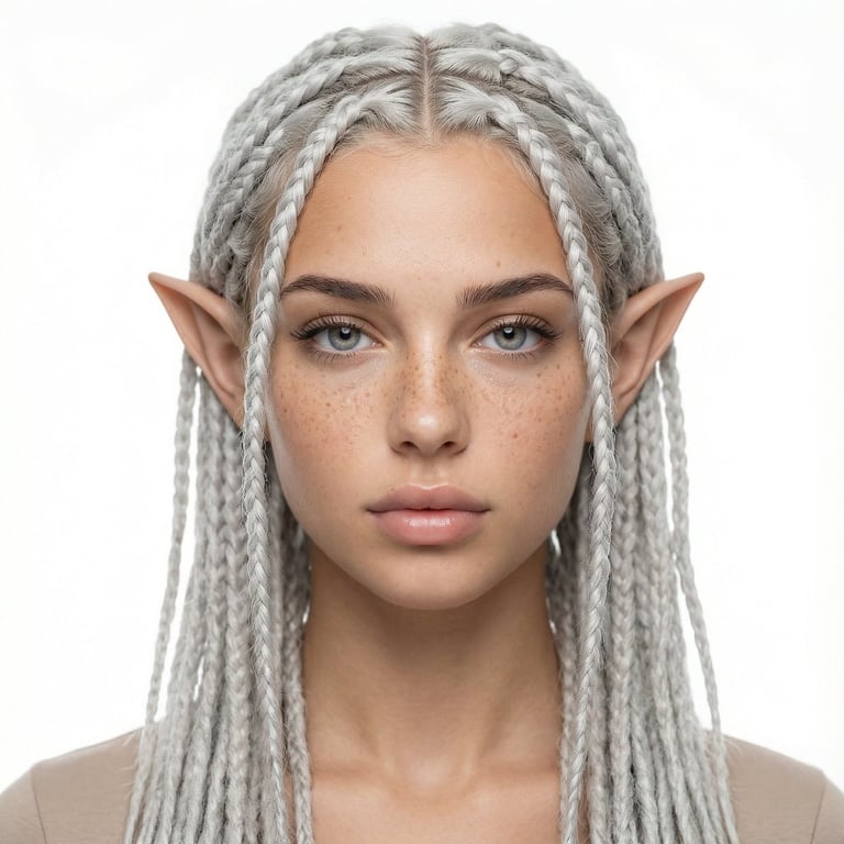 A detailed JSON prompt for generating a photorealistic studio portrait of a woman, transforming her human ears into elegant fantasy avatar ears while strictly locking her identity, skin texture, and facial proportions based on a reference image.