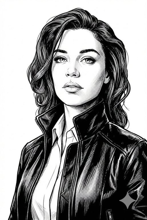 A prompt for creating a highly detailed black and white digital illustration in a comic book/vector art style. It requires using an uploaded photo for the person's likeness, depicting them in a formal shirt and leather jacket, with a focus on high contrast shading, cross-hatching texture, and a noir graphic novel aesthetic.