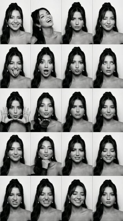 A highly detailed structured prompt for generating a 4x4 grid of black and white photobooth-style images, focusing on preserving the identity of an uploaded reference image while depicting 16 distinct facial expressions with specific lighting and texture requirements.