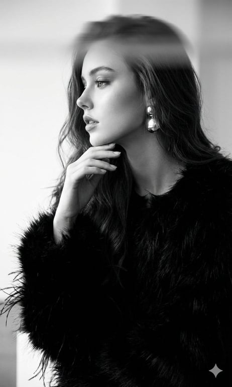 A prompt for generating a black-and-white surreal editorial portrait, focusing on a clean profile, high-contrast diffused lighting, and specific subject details like a voluminous fur/feather top and subtle motion blur across the top of the frame.