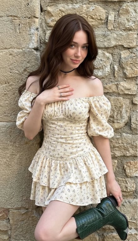 A detailed JSON prompt for Gemini Nano Banana Pro to generate a medium shot, photorealistic image of a young woman in a cottagecore mini-dress, leaning against a stone wall, holding a dark green cowboy boot, emphasizing a moody, bohemian aesthetic.