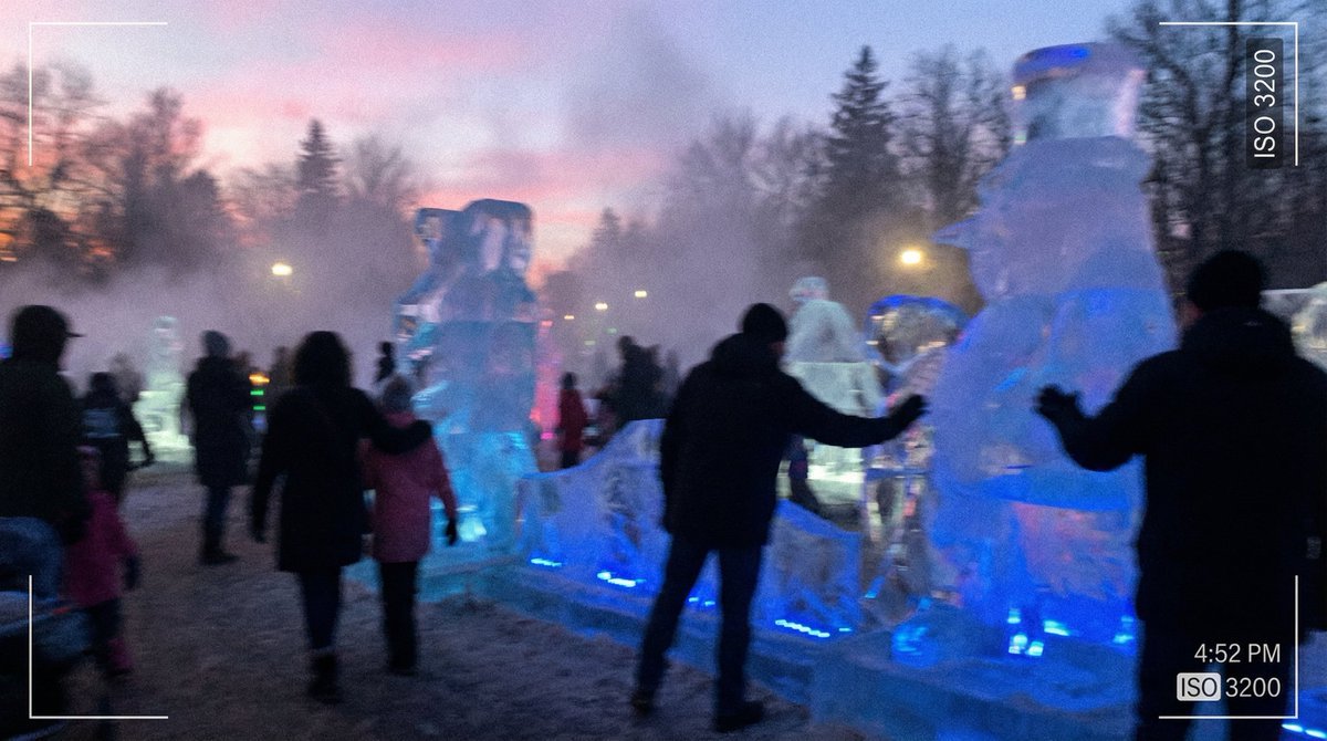 A prompt for generating a candid, authentic iPhone-style photo of an ice sculpture installation at dusk, emphasizing natural motion blur, visible noise from high ISO, cool glacier blue lighting, and an atmospheric winter fog, simulating an unposed documentary aesthetic.