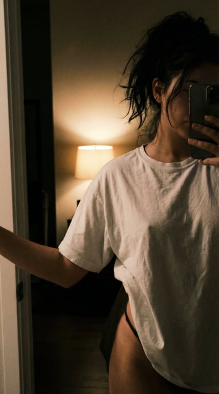 A structured JSON prompt for generating an ultra-realistic, cinematic, and moody portrait of a woman taking a mirror selfie. The scene is a cozy bedroom interior with warm tungsten lighting, focusing on the subject wearing an oversized white t-shirt and minimal black underwear, emphasizing candid and intimate authenticity.