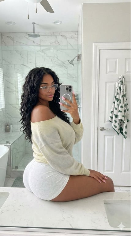 A highly detailed JSON prompt for generating an ultra-realistic, candid mirror selfie taken by a woman seated on a quartz vanity in a modern bathroom, focusing on specific physical details, clothing, phone model, and the reflection elements, aiming for an amateur realism style.