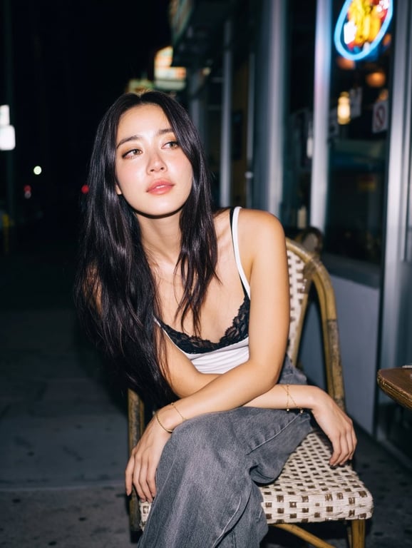 A detailed prompt designed to generate a candid nighttime street portrait of a young woman using a flash photography aesthetic, emphasizing high contrast, sharp highlights, and an authentic city nightlife vibe. This prompt is used to compare the output quality between Midjourney V8 and Nano Banana Pro.