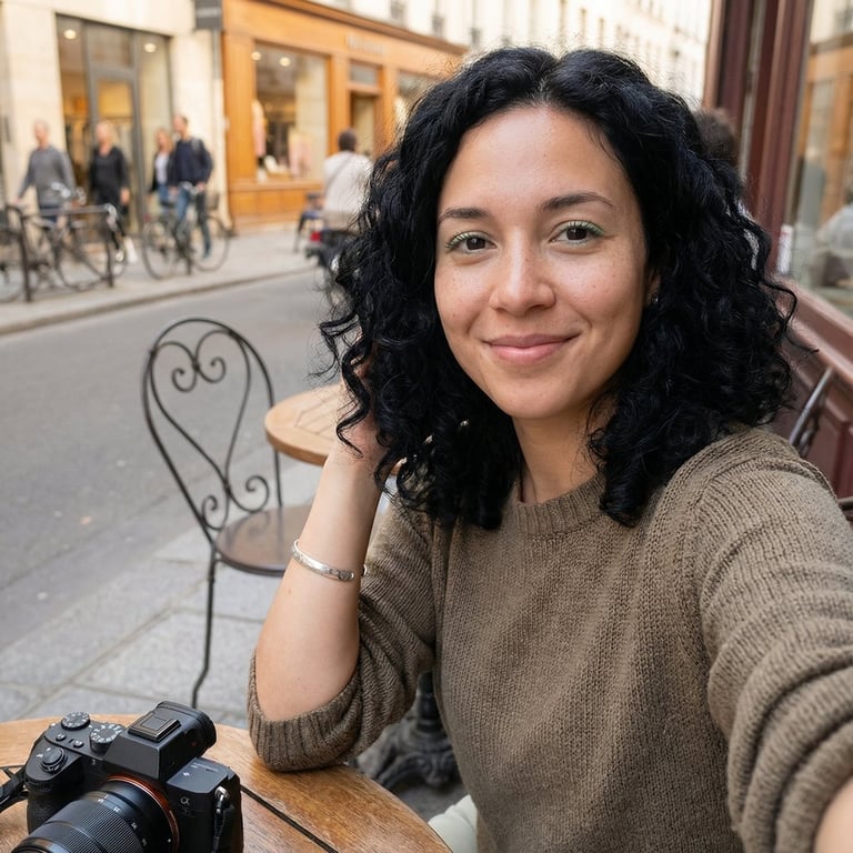 A structured JSON prompt for generating a candid outdoor selfie of a woman at a European-style street cafe, detailing her appearance (freckles, light blue mascara), props (system camera on the table), and emphasizing soft natural light and a cinematic street photography vibe.