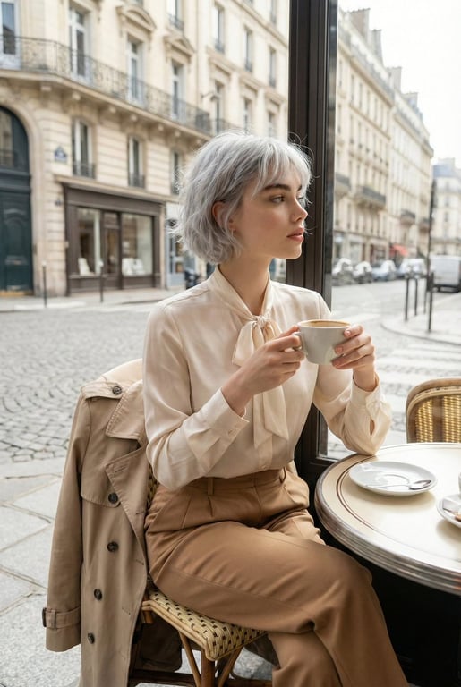 A detailed prompt for generating a candid lifestyle portrait of a young woman with short silver-gray hair sitting at a classic Parisian café. It specifies her attire (cream blouse, beige trousers, trench coat), the setting (cobblestone street, Haussmann buildings), and technical details (natural daylight, warm neutral palette, shallow depth of field, 50mm lens look) for an editorial aesthetic.