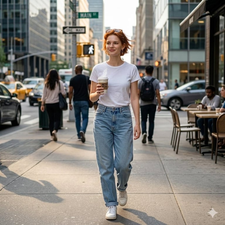 A prompt for generating a highly realistic, 8K candid street photograph of a young woman walking on a busy city sidewalk. It specifies her casual attire (white t-shirt, baggy jeans, coffee cup), the natural sunlight and reflections, and the technical details of street photography (50mm lens, shallow depth of field, natural colors).