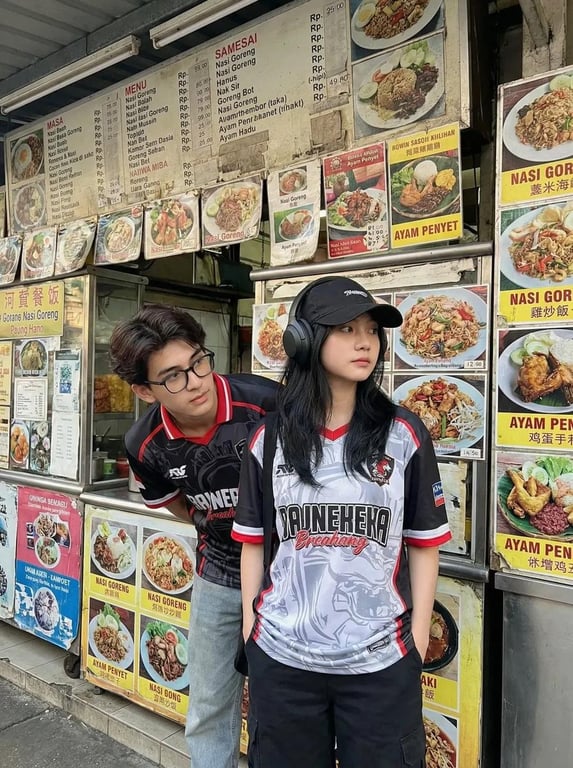 A detailed image generation prompt for nano-banana-pro, designed to create a candid street photography scene. The prompt specifies the setting (a busy Southeast Asian street food stall with Indonesian dishes), the subjects (two young adults in esports-style jerseys), their expressions and positioning, and detailed photographic parameters (soft daylight, 35mm lens, shallow depth of field, documentary realism).