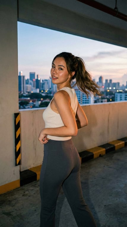 A detailed, structured prompt for generating an ultra-photorealistic, candid portrait of a young woman in an urban setting (parking garage rooftop) during sunset/blue hour. It emphasizes a 'raw social media realism' style, avoiding the 'posed influencer look,' and focuses on capturing a spontaneous, accidental moment with specific body type, outfit (tight ribbed top, stretch pants), and lighting details (mixed warm sunset and cool city light).