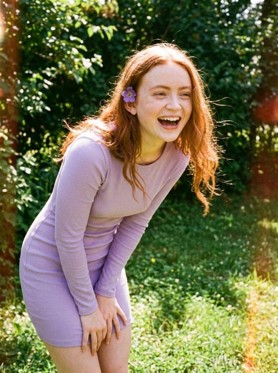 A detailed prompt for Nano Banana Pro to generate a candid, vintage disposable camera style photo of a young woman outdoors in a garden, strictly preserving identity from a reference image, focusing on natural texture, strong sunlight, and a playful, carefree mood.