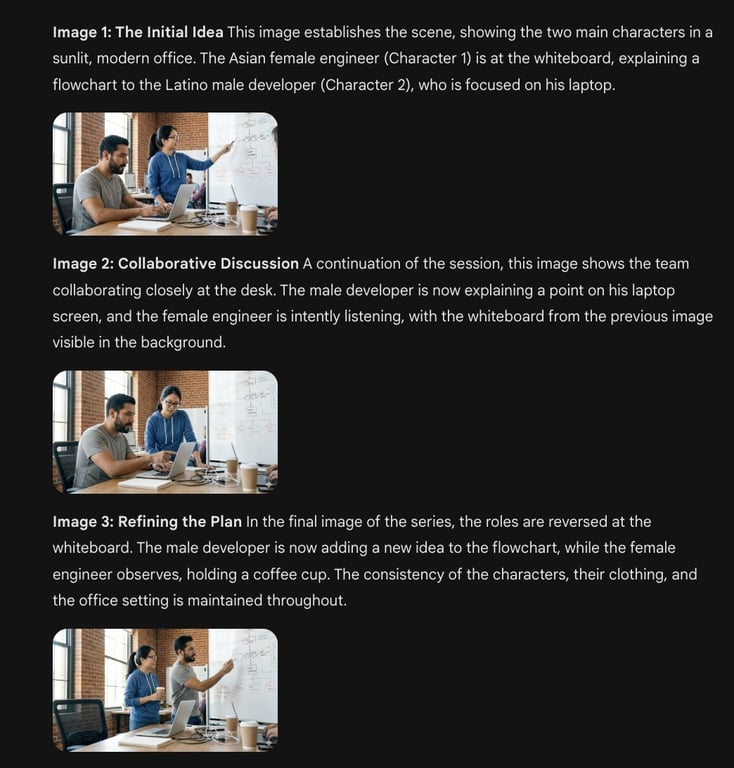 A template and an example prompt demonstrating how to use JSON parameters in Nano Banana Pro to maintain character consistency across multiple images, specifically for a tech startup team brainstorming scene.