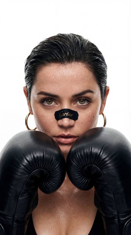 A highly detailed cinematic prompt for a close-up portrait of a female boxer, focusing on strength and style. It specifies technical camera details (ARRI Alexa LF, 50mm lens), visual elements (sweat, black boxing gloves), and product placement (Cartier logo sticker and gold earrings).