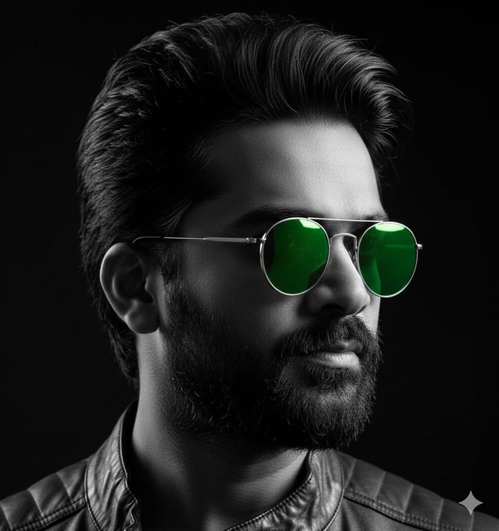 A detailed JSON prompt for Gemini Nano Banana Pro to generate an 8K hyper-realistic, high-contrast cinematic portrait. The image is black and white, but uses selective color to highlight the reflective emerald green lenses of the subject's sunglasses. It requires strict face identity lock based on an uploaded reference image.