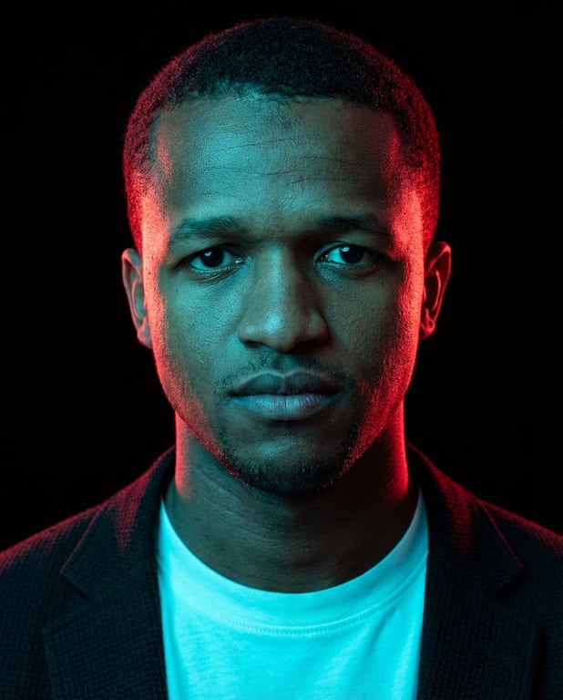 A structured JSON prompt for generating a high-contrast, cinematic studio portrait in a cyberpunk style, emphasizing sharp focus on the face, visible skin texture, and dramatic split lighting using cyan/blue and red/magenta neon tones against a pure black background. This prompt is designed for professional, high-impact editorial visuals.