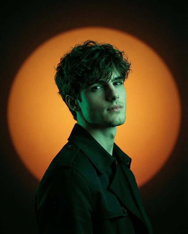 A highly specific prompt for generating a minimalist cinematic fashion editorial portrait using a reference photo for identity. It details the composition (vertical 4:5, mid-torso), pose, wardrobe (trench coat), and complex lighting setup, featuring a strong emerald-green gel key light and a circular amber/orange 'sun' spotlight projection in the background.