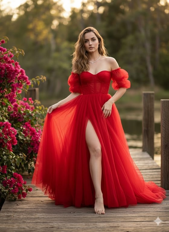 A highly detailed prompt for a cinematic fine-art photograph of Ana de Armas seated on a rustic wooden bridge or dock. She is wearing a vibrant red off-the-shoulder gala dress with a high slit, set during golden hour with lush pink flowers framing the scene, emphasizing shallow depth of field and romantic elegance.