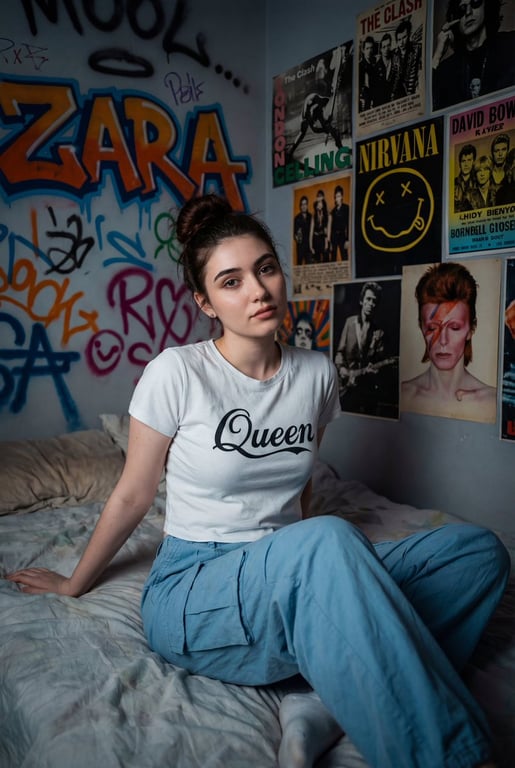 A detailed prompt for generating a high-quality, cinematic medium close portrait of a woman with a grunge aesthetic, featuring specific clothing, hairstyle, and a vibrant, graffiti-covered background with dramatic lighting.