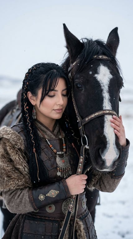 A detailed JSON prompt for Nano Banana Pro to create a cinematic, intimate portrait of an ancient Turkic woman and her horse in a snowy steppe landscape, emphasizing historical realism, spiritual bonding, and a cold, natural cinematic color grade.