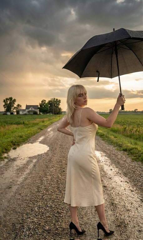 A detailed image generation prompt for a cinematic, moody, and atmospheric portrait of Sabrina Carpenter. The prompt specifies her pose (crouching with an umbrella), attire (cream slip dress), and a dramatic environment featuring a wet gravel road, storm clouds, and a sunset glow.