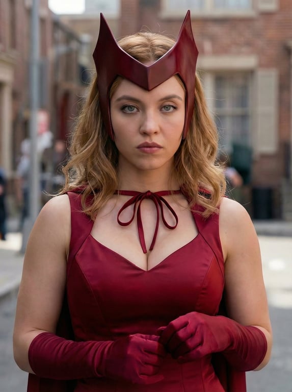 A highly detailed JSON prompt for generating a cinematic, realistic portrait of actress Sydney Sweeney as Wanda Maximoff (Scarlet Witch). The prompt specifies a dramatic visual tone, deep crimson costume details (satin dress, angular crown), and focuses heavily on facial expression (determined, conflicted) and realistic skin texture.