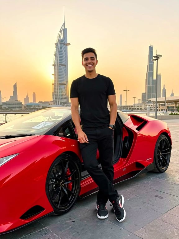 A prompt for generating an ultra-realistic 8K cinematic full-body portrait of a handsome young man (preserving his exact face from a reference photo) standing next to a bright red Lamborghini Huracán with open scissor doors during golden hour sunset in Dubai, emphasizing luxury lifestyle and photorealism.