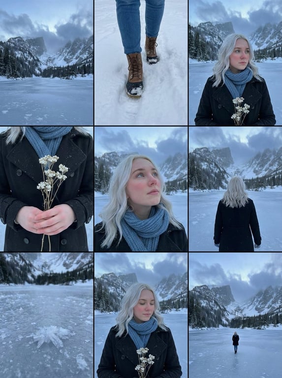 This is an image generation prompt designed for Nano Banana Pro to create a 3x3 cinematic storyboard contact sheet. It details a sequence featuring a young woman in a frozen alpine winter setting, specifying the arrangement of nine distinct panels, including close-ups, medium shots, and wide shots, all unified by a moody blue-hour twilight aesthetic and high-quality film photography style.