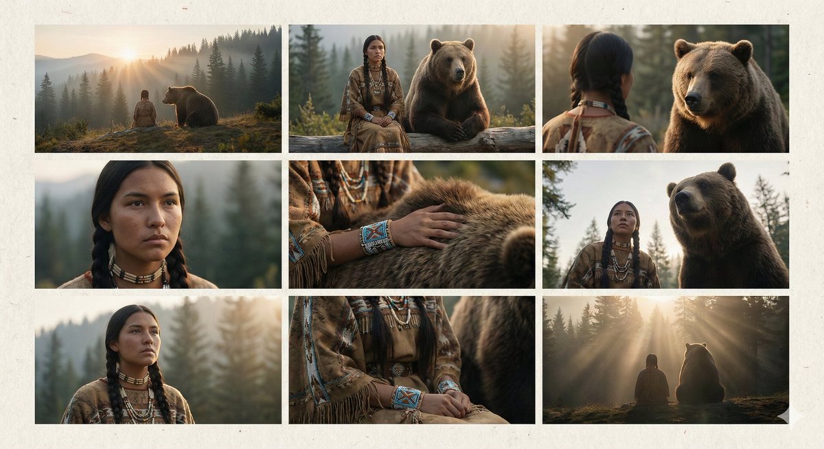A prompt for generating a 3x3 grid storyboard collage featuring a young woman in traditional patterned clothing sitting beside a large, calm bear in a misty mountain forest. The style is highly realistic, cinematic, and emphasizes detailed textures and golden hour lighting.