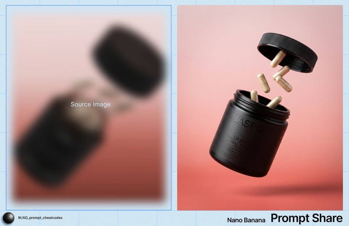A detailed prompt for generating a high-quality commercial product image of a supplement container. It specifies the composition (jar and cap suspended mid-air with capsules floating between them), material details (matte black jar, semi-opaque capsules), lighting (soft, directional key light, moderate contrast), and a seamless pink-to-coral gradient background, aiming for a clean, professional look.