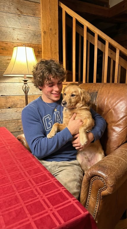 A JSON prompt for Gemini Nano Banana Pro generating a candid, wholesome lifestyle photograph of a young man sitting on a leather couch in a warmly lit cabin interior, holding a golden retriever.
