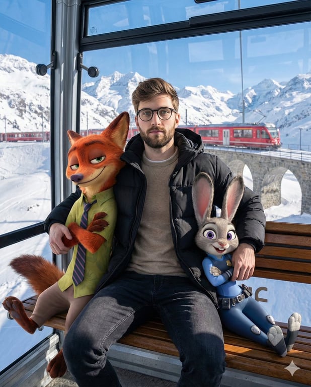 A detailed prompt for generating a photorealistic image blending a human subject with animated characters (Nick Wilde and Judy Hopps from Zootopia) inside a glass cable car in the Swiss Alps. The scene emphasizes cozy luxury travel, ultra-detailed textures, and seamless integration of the photorealistic human and high-quality animated figures.