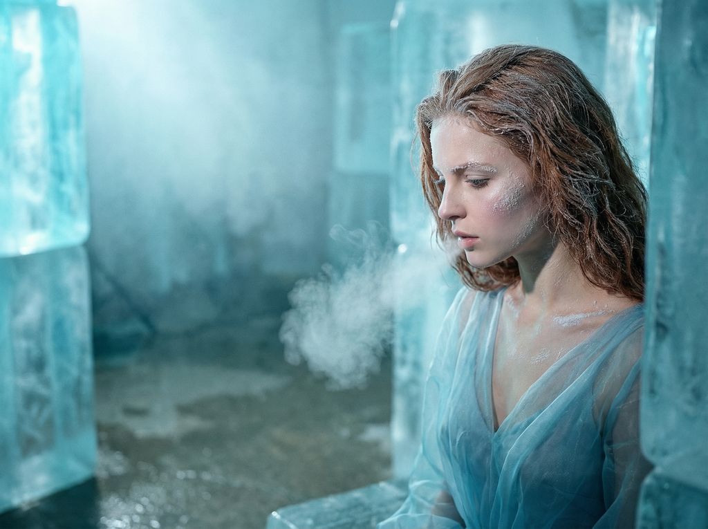 A highly detailed JSON prompt for generating a hyper-realistic, cinematic narrative portrait titled 'Crystallized Melancholy'. It features a subject in an avant-garde ice sculptor's atelier, emphasizing high negative space, volumetric cyan lighting passing through ice blocks, practical frost makeup effects, and specific medium format camera settings (Hasselblad H6D-100c) for tactile, physical textures.