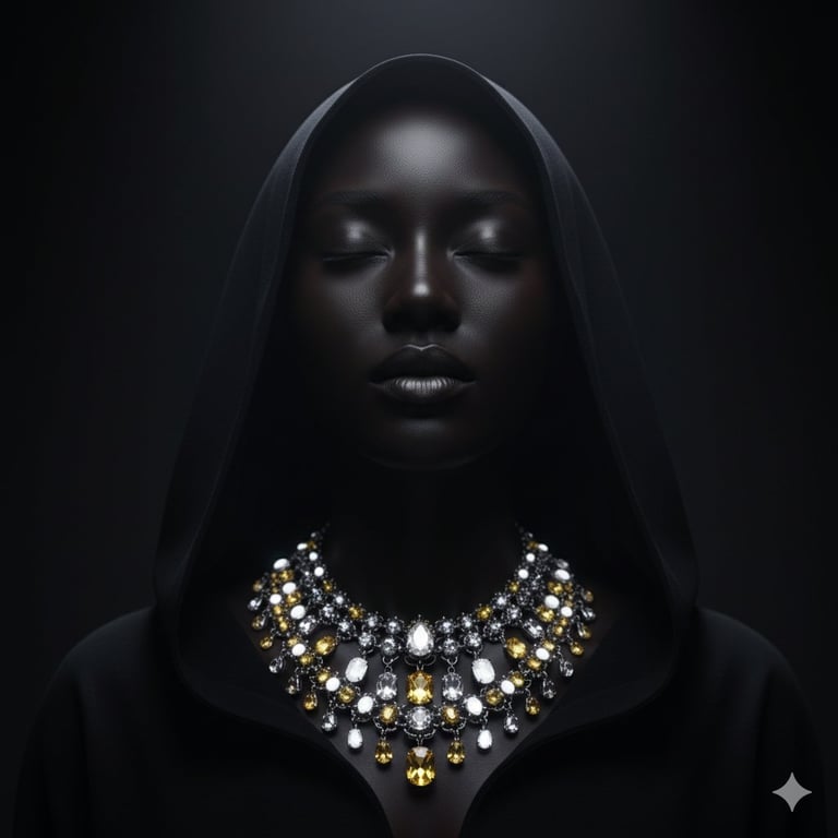 An image generation prompt for a highly dramatic, low-key portrait focusing on fine jewelry. The subject has deep black skin and is wearing a dark hooded garment, with the main light source emanating from an ornate, multi-tiered necklace featuring white and yellow gemstones.