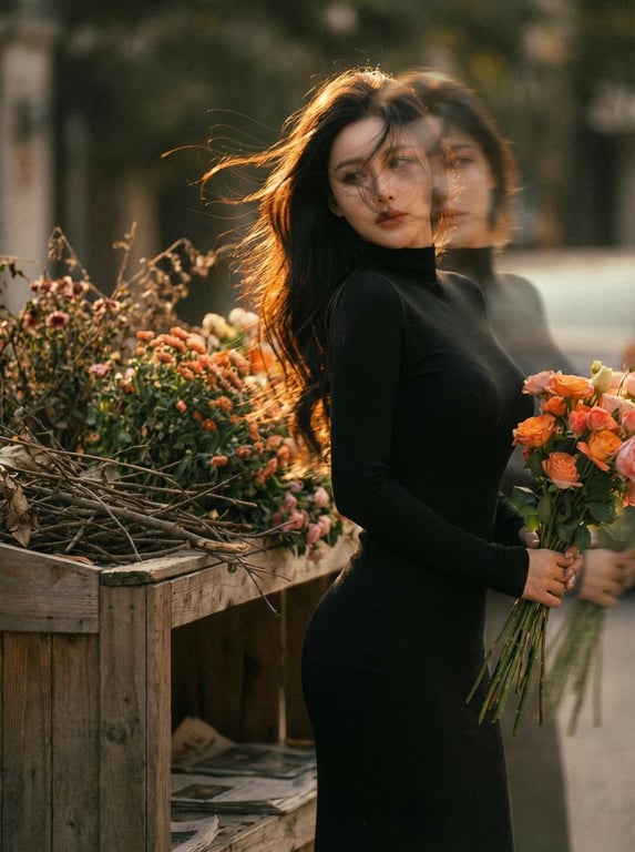 A prompt for generating a cinematic, dreamy portrait featuring a young woman holding roses at a rustic flower stand. The key element is a subtle double-exposure/motion blur effect, showing a ghosted second profile of her face, combined with warm golden sunset lighting, film grain, and shallow depth of field for an ethereal, surreal feeling.