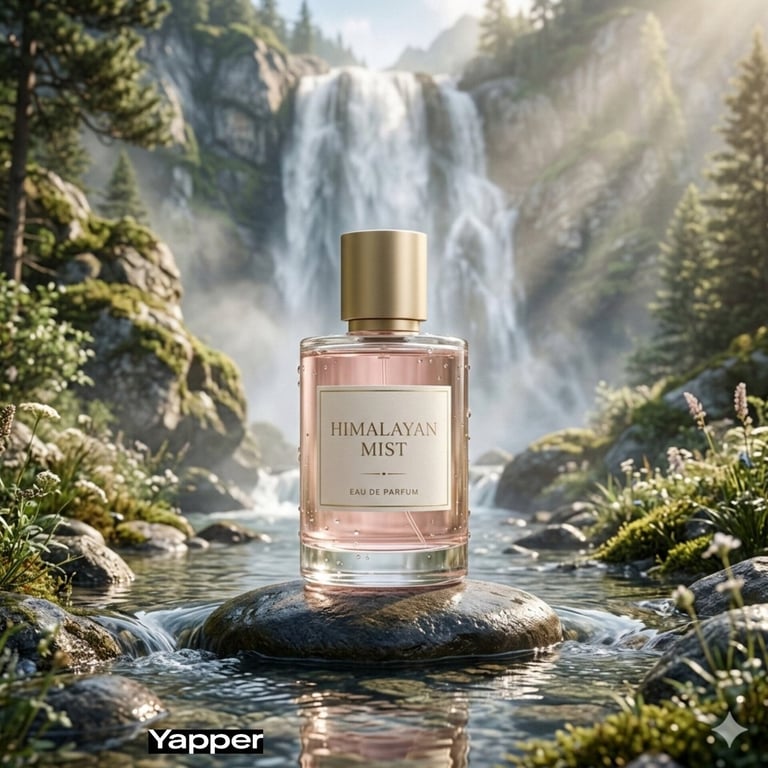 A comprehensive prompt designed to generate ultra-realistic, high-end product photography for a luxury perfume bottle set in a serene natural paradise. It specifies the bottle's details, the environment (waterfall, lush foliage), lighting (filtered sunlight, cinematic glow), and technical specifications for an ethereal, editorial finish.