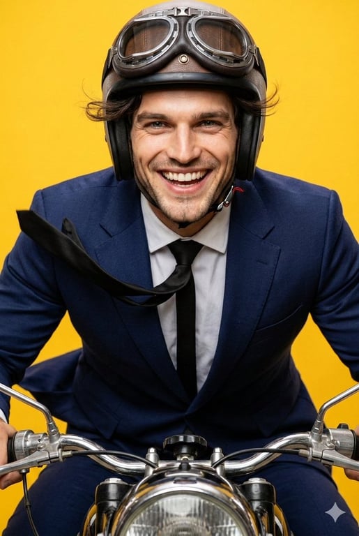 A prompt for generating an ultra-realistic photograph of a person sitting on a motorcycle, wearing a formal suit and vintage helmet. The image must capture a dynamic sensation of high speed, with wind visibly blowing the suit and a clear focus on the person's expression of great happiness, all set against a vibrant yellow background.