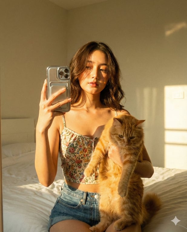 A detailed prompt for generating a hyper-realistic mirror selfie that mimics the aesthetic of an early-2000s digital camera snapshot. The scene features a woman (identity locked to a reference) holding an orange tabby cat, dressed in vintage-style apparel, bathed in soft late-afternoon golden sunlight, complete with digital noise and grain.