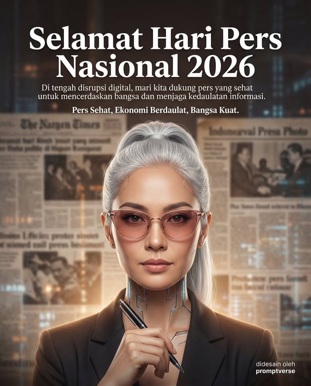 A highly detailed and structured prompt for generating an ultra-realistic official editorial poster for Indonesia's National Press Day, featuring a formal portrait of a female journalist as a refined cyborg, symbolizing the balance of human conscience and technology, with specific requirements for lighting, typography, and text content.