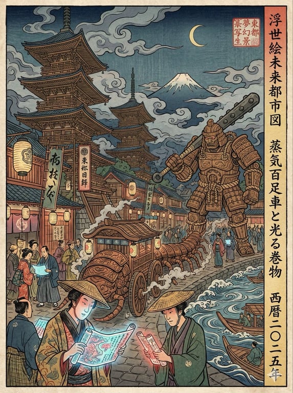A highly-structured image prompt to depict a modern-day scene reimagined as an Edo-period Japanese Ukiyo-e woodblock print, with detailed guidance on anachronistic tech, composition, texture, and color.