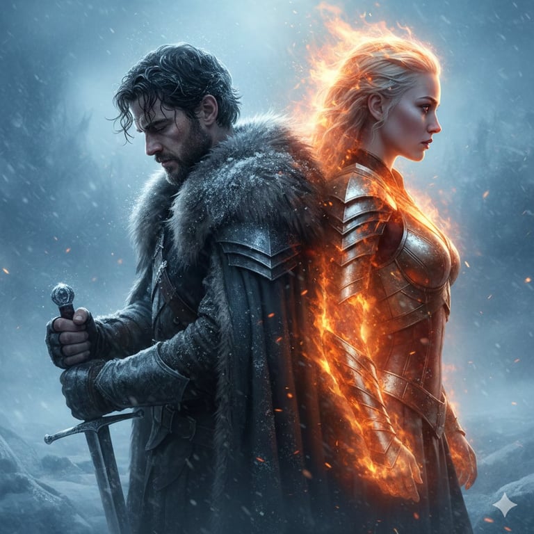 A prompt for generating a dramatic, cinematic poster-style portrait of two epic fantasy warriors standing back-to-back in a frozen storm, symbolizing the clash of fire and ice with specific details on their appearance, attire, and the contrasting lighting and atmosphere.