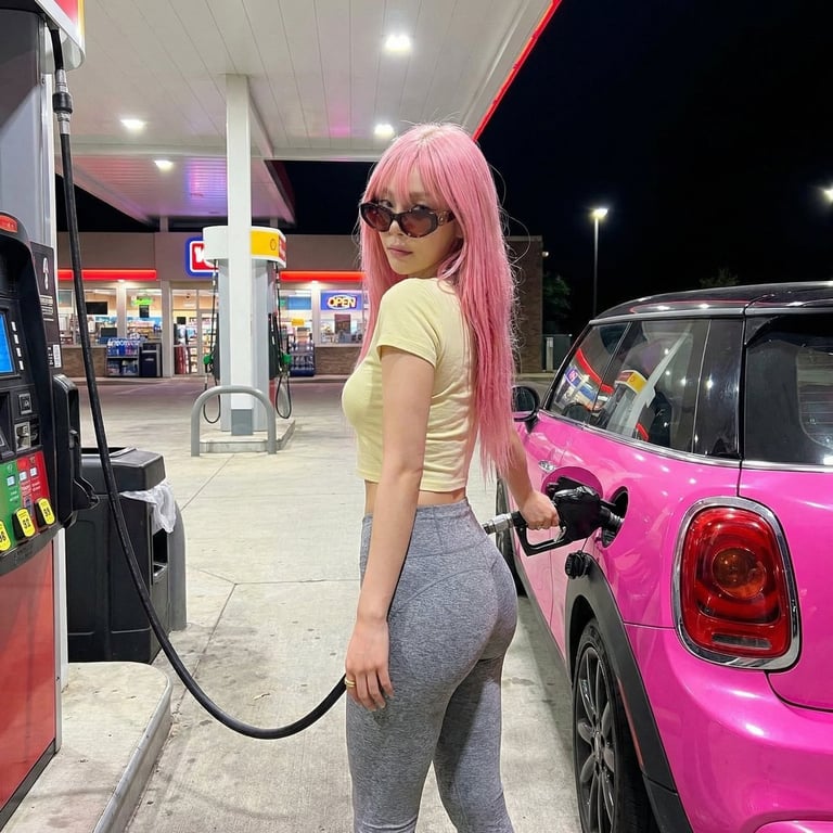 A highly specific, constraint-heavy prompt for Nano Banana Pro to generate a photorealistic vertical image of a woman with an extremely exaggerated 'slim-thick' hourglass figure (tiny waist, massive glutes) pumping gas at a brightly lit station at night. The prompt strictly dictates physique, pose (looking over the shoulder), wardrobe (light yellow crop top, grey leggings), scene elements (pink Mini Cooper), and lighting.
