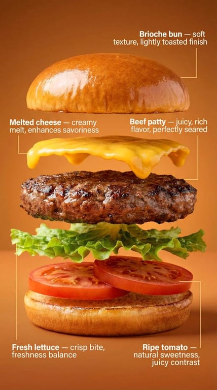 An image generation prompt for creating a technical, exploded-view composition of a burger. It requires exactly five separated, floating layers (bun, patty, cheese, lettuce, tomato) with even spacing, maintaining photorealism. The prompt also includes instructions for adding clean annotations with specific benefit descriptions for each layer, set against a slightly darkened background for readability.